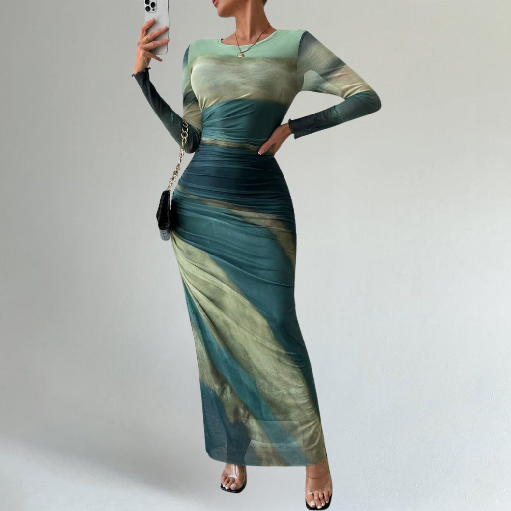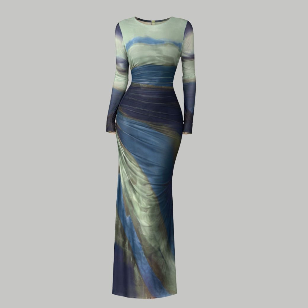 Dress – Womens – All Season – Printed Long Sleeve Bodycon Maxi Dress – Montford Co